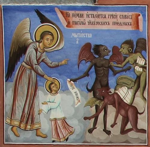 Бесы на мытарствах не требуют с людей того, что не принадлежит им, бесам. Речь идет о грехах, пороках и преступлениях, и если человек в своей земной жизни отождествился со всем этим, то они рассматривают такого человека как свою добычу. Но если расторжение между грехом и человеком осуществилось до момента его смерти, то ему нечего опасаться на мытарствах. Лестница от земли до неба не есть некий бесовский «лифт»: где хотят, там и остановят. Напротив, вспомним: «И увидел во сне: вот, лестница стоит на земле, а верх ее касается неба; и вот, Ангелы Божии восходят и нисходят по ней. И вот, Господь стоит на ней и говорит: Я Господь, Бог Авраама, отца твоего, и Бог Исаака; [не бойся]…» (Быт. 28, 12–13). Она так и изображается на православных иконах, эта лестница: наверху восседает или стоит Господь, Ангелы помогают душам подниматься по ней. И хотя этот божественный призыв «не бойся» свидетельствует о некоторой опасности, но душа, успевшая до момента физической смерти примириться с Богом, ничем не рискует и свободно восходит на Небеса. Бесы-«мытники» – скорее случайный элемент близ такого важного и ответственного места для восхождения в Царствие Небесное, как лестница Иакова. Но так как человек наделен свободной волей, он имеет право не только на восхождение, но и на выпадение из духовного мира, и это оправдывает присутствие бесов здесь. Как и присутствие сатаны в «день, когда пришли сыны Божии предстать пред Господа» (Иов 1, 6).