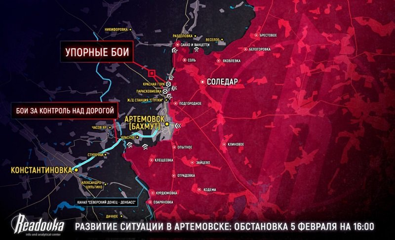 Одновременно с этим продолжаются бои к юго-западу за дорогу, которая ведет на Константиновку. По некоторым данным, ЧВК «Вагнер» пытаются перерезать этот путь, который пролегает между Ступочками и Красным (Ивановским). Параллельно с Артемовском также продолжается продвижение и к Северску, где идет наступление на Веселое и Раздоловку.