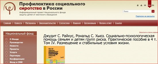 Методики Джудит Райкус и Рональда Хьюза, переведенные с английского этой НКО, в 2013 году Минтруд рекомендовал российским регионам в качестве основы для региональной работы ювенальных ведомств. Вышеупомянутый 4-томник - лишь одна из них: