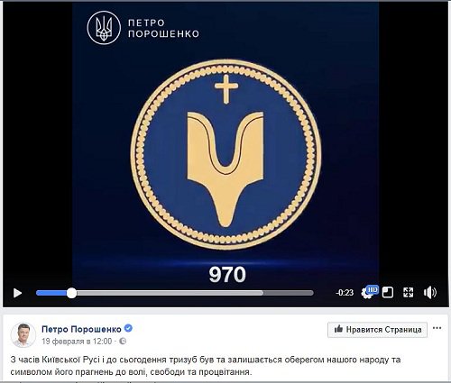 В честь 26-летия принятия трезубца в качестве т.н. «малого герба Украины» Порошенко заявил: «Со времён Киевской Руси и до наших дней трезуб был и остаётся оберегом нашего народа и символом его стремлений к свободе, свободы и процветания».