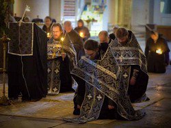 При произнесении священником великого отпуста — молитвы Владыко, Многомилостиве необходимо преклониться до земли, с сердечным умилением испрашивая у Господа прощение согрешений.