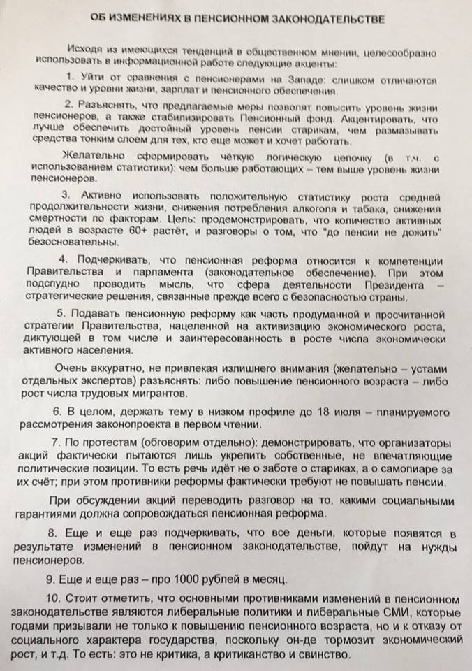 Источник: http://ruskline.ru/politnews/2018/iyun/27/kremlyovskaya_metodichka_dlya_smi_po_povysheniyu_pensionnogo_vozrasta/