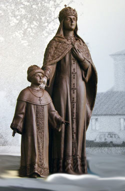 Автором скульптурной группы из кованой меди, представляющей молодую царицу и юного царевича Алексея, является заслуженный скульптор России Николай Любимов. По его замыслу, царица с сыном выходит после благословения от старца из монастыря навстречу жизни, навстречу империи и навстречу паломникам, прибывающим в монастырь.