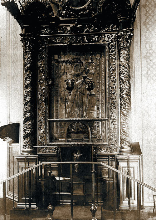 Киот с древней Боголюбивой иконой Божией Матери в Боголюбском соборе. Фото нач. XX века.