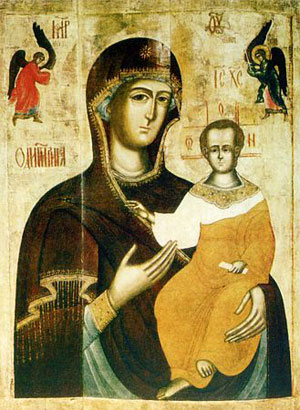 Заступница Усердная. Празднование в честь "Смоленской" иконы Божией Матери установлено: 28 июля (10 августа) в память прибытия иконы на Русь в 1046 году, 24 ноября (7 декабря) в память заступничества Богородицы при битве с Батыем и 5 ноября (18 ноября) в честь изгнания врагов из Отечества в войне 1812 года. Чудотворная икона Пресвятой Богородицы, именуемая "Одигитрия-Смоленская", известна на Руси с древнейших времен. Одигитрия (греч. - Путеводительница) - один из самых распространенных типов изображения Пресвятой Богоматери с младенцем. На левой руке Божией Матери сидящий Младенец - правой рукой Он благословляет, а левой - держит свиток, реже - книгу, что соответствует иконографическому типу Христа Пантократора (Вседержителя). С догматической точки зрения основной смысл этого образа - явление в мир Небесного Царя и Судии и поклонение Царственному Младенцу. Греческий император Константин Порфирородный, выдавая в 1046 году свою дочь царевну Анну за черниговского князя Всеволода Ярославича, сына Ярослава Мудрого, благословил ее в путь чудотворной иконой Одигитрией. После смерти князя Всеволода его сын Владимир Мономах в 1095 году перенес икону из Чернигова в Смоленск, где в 1101 году заложил соборный храм Успения Пресвятой Богородицы. С 1111 года икона хранилась в Смоленском соборном храме, откуда произошло современное ее название. С помощью Божией благочестивый князь Владимир Мономах смирил непокорных удельных князей и, став великим князем Киевским, своей крепкой десницей установил на Руси мир и спокойствие. О чудотворениях от иконы известно с середины XI века, но ее местное почитание на Руси складывается на два столетия позже, в страшные годы монголо-татарского разорения, когда русские люди особенно поверили в чудотворную силу Смоленского образа. Из многочисленных чудес, совершившихся от этой иконы, особенно замечательно избавление Смоленска от татар. В 1239 году, во время грозного нашествия на русскую землю диких полчищ Батыя, один из татарских отрядов зашел в Смоленскую область, и Смоленск подвергался опасности быть разграбленным. Жители, чувствуя себя не в силах отразить грозного врага, обратились с горячей мольбой к Божией Матери. Богоматерь услышала их моления и даровала городу спасение ради святой иконы Своей Одигитрии. Татары остановились в Долгомостье, в 24 верстах от Смоленска, с намерением произвести внезапное нападение на город. В это время в дружине смоленского князя находился один воин, по имени Меркурий, человек весьма благочестивый. Его именно Богоматерь и избрала Своим орудием для спасения города. В ночь на 24 ноября в кафедральном соборе, где стояла чудотворная икона Одигитрии, церковный пономарь получил от Нее повеление объявить Меркурию: — Меркурий! Изыди скоро в броне воинской, ибо тебя зовет Владычица. В память избавления Смоленска от нападения татар чудесным заступлением Богоматери и поныне 24 ноября празднуется всенощным бдением и благодарственным молебствием перед чудотворным образом Одигитрии. Еще не было окончательно сброшено татаро-монгольское иго, как новый враг стал теснить Русь, на этот раз с Запада. Смоленск стал одним из важнейших городов на западных границах Руси, а Смоленская икона Богоматери - защитницей и покровительницей ее западных рубежей. В 1395 году город перешел во временное владение Литовских князе