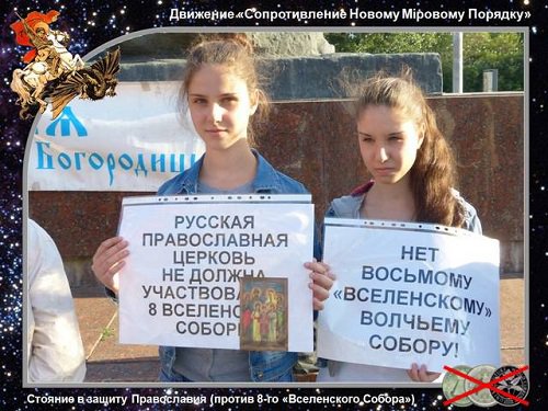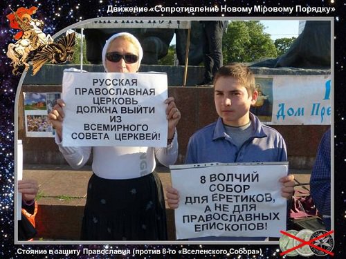20 июня с. г. в Москве, по инициативе Союза «Христианское Возрождение» и Движения «Сопротивление Новому Мировому Порядку» прошло молитвенное стояние «В защиту Православия». Участники стояния выступили против намеченного на 2016 год т.н. 8-го Вселенского Собора, целью которого является разрушение основ Православной Веры. Также верующие требовали выхода Русской Православной Церкви Московского Патриархата из еретической организации - Всемирного Совета Церквей.