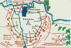 19 августа русское войско численностью в 150 тысяч человек расположилось под Казанью, на луговой стороне. На другой день перебежчик из неприятельского стана поведал о численности татарского гарнизона (30 тысяч), моральном духе, царившем в неприятельском стане, запасах продовольствия и т.д. Крепость находилась на высокой и крутой возвышенности, примерно в 6 км от Волги, вверх по речке Казанке. Она была обнесена двойными дубовыми стенами, заполненными землей и камнем, с деревянными же башнями, окопана рвом и имела двенадцать ворот; посередине крепости шел овраг, прикрывавший большие каменные здания ханского двора и мусульманские мечети. Дальше, к востоку, на плоской возвышенности, стоял сам город, также обнесенный деревянными стенами с башнями, а еще дальше — Арское поле, с обрывами по обе стороны; с третьей стороны примыкал к нему густой лес. Подступы к Казани были трудны; местность изобиловала болотами, зарослями кустарника, лесами.