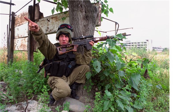 Лето 2002 г. Снайпер во время обстрела боевиков в Ленинском районе Грозного (фото Юрия Тутова)